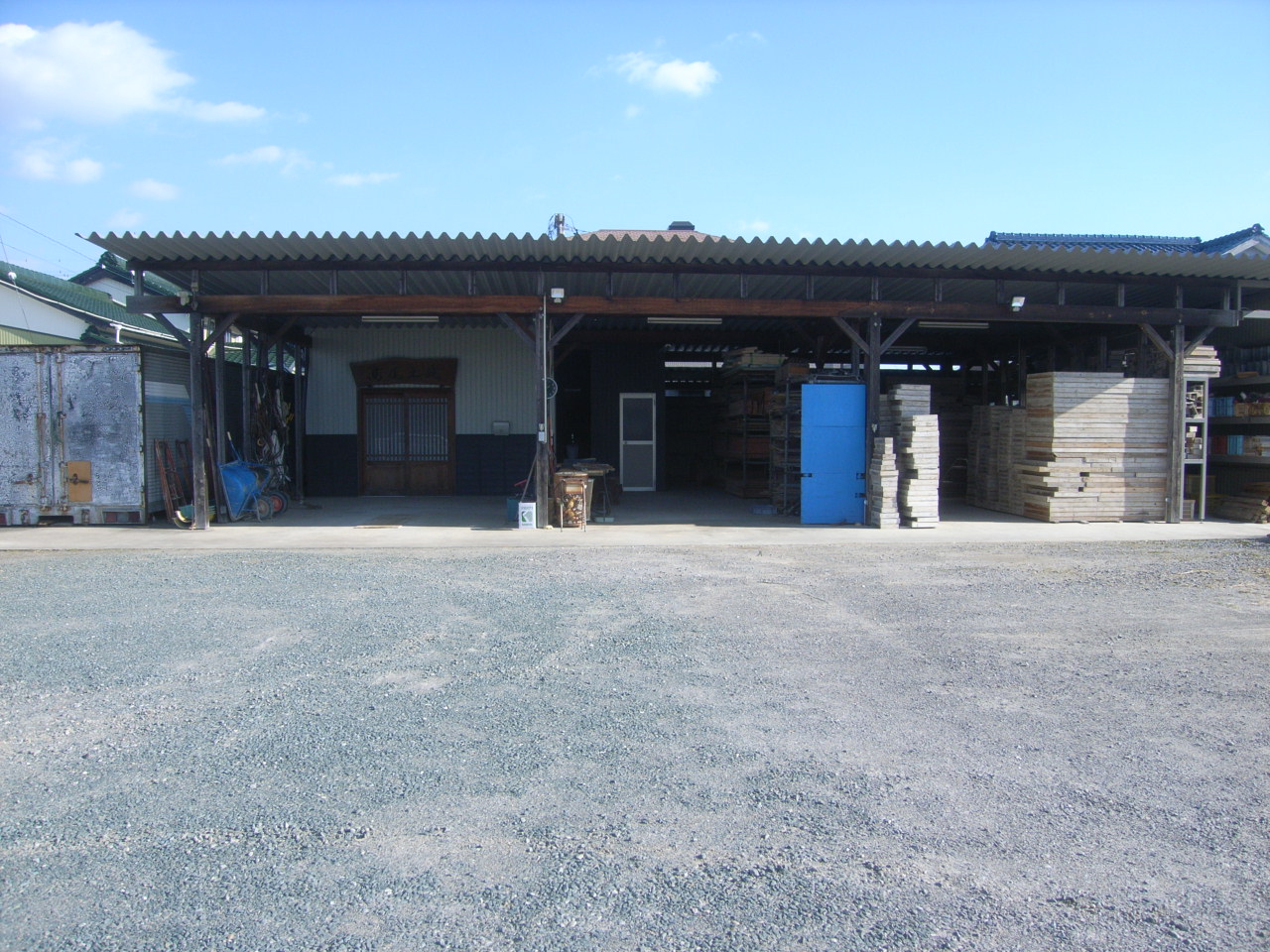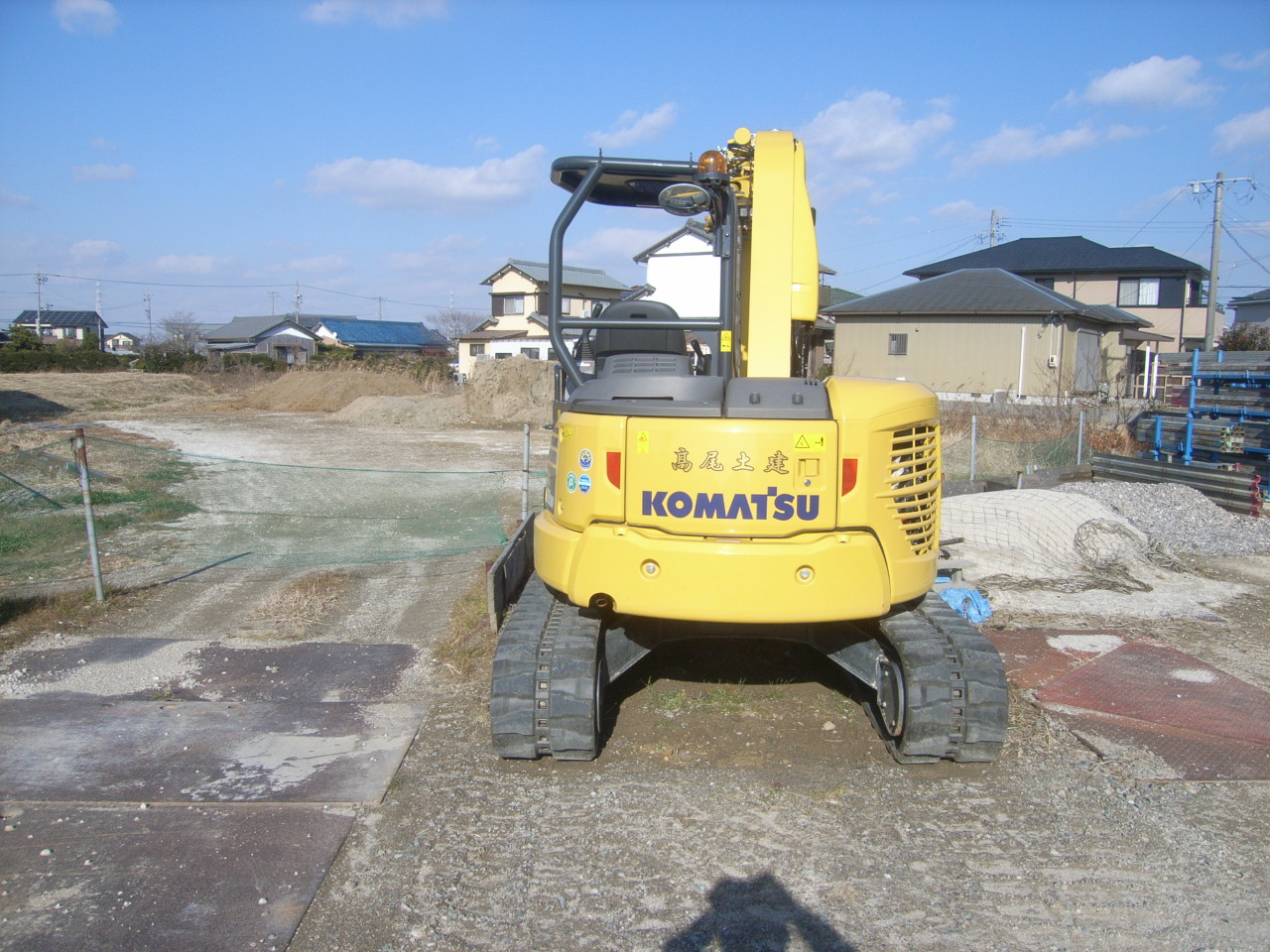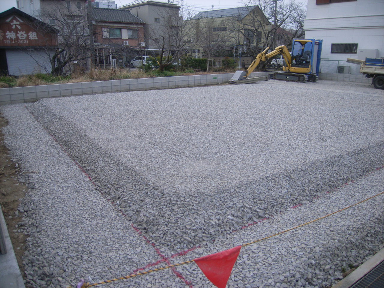 細かく砕いた石、「砕石」を敷地全体にまいて、地面を転圧することで地盤を固めます。