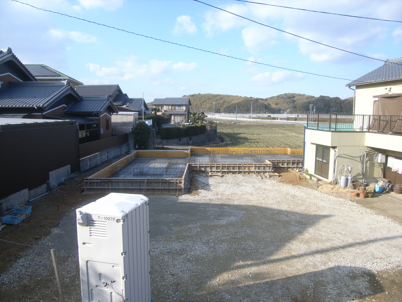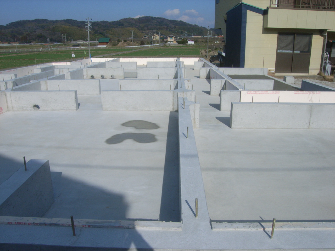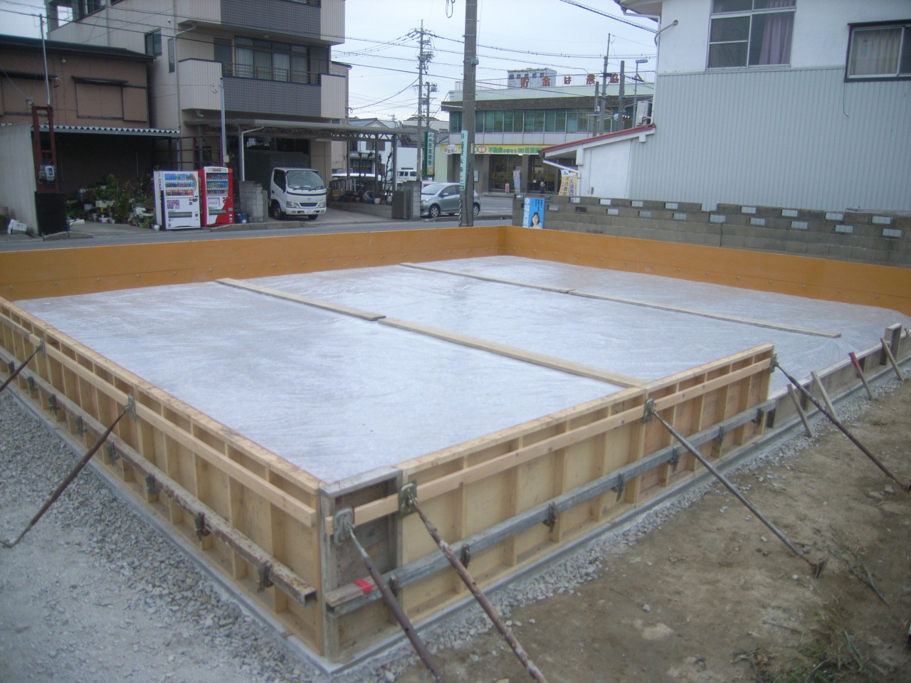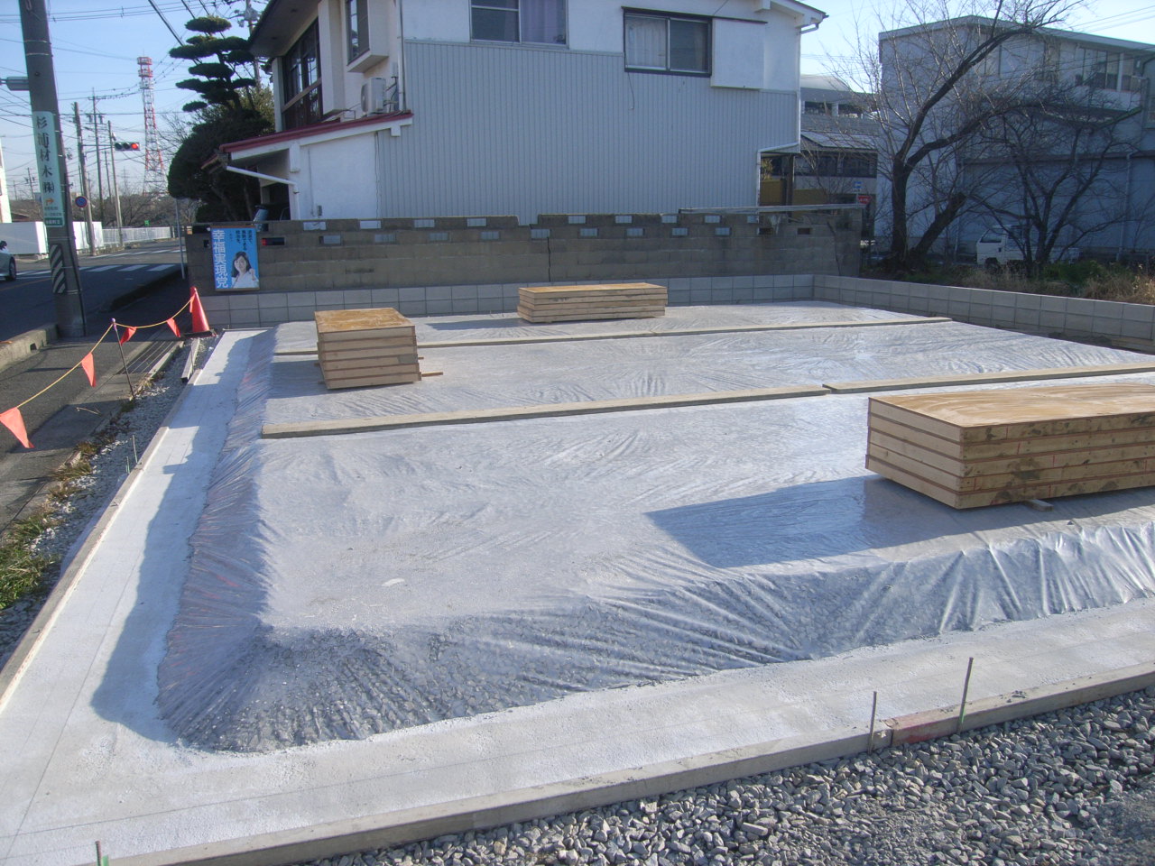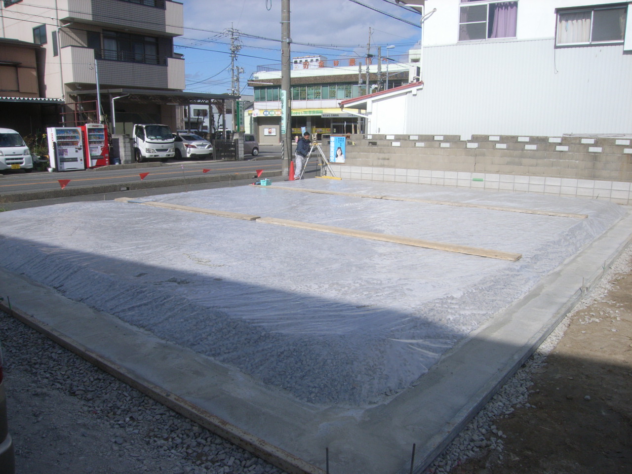 その上を「防湿シート」でおおったあと、建物の建築位置を示すためにコンクリートを流します。