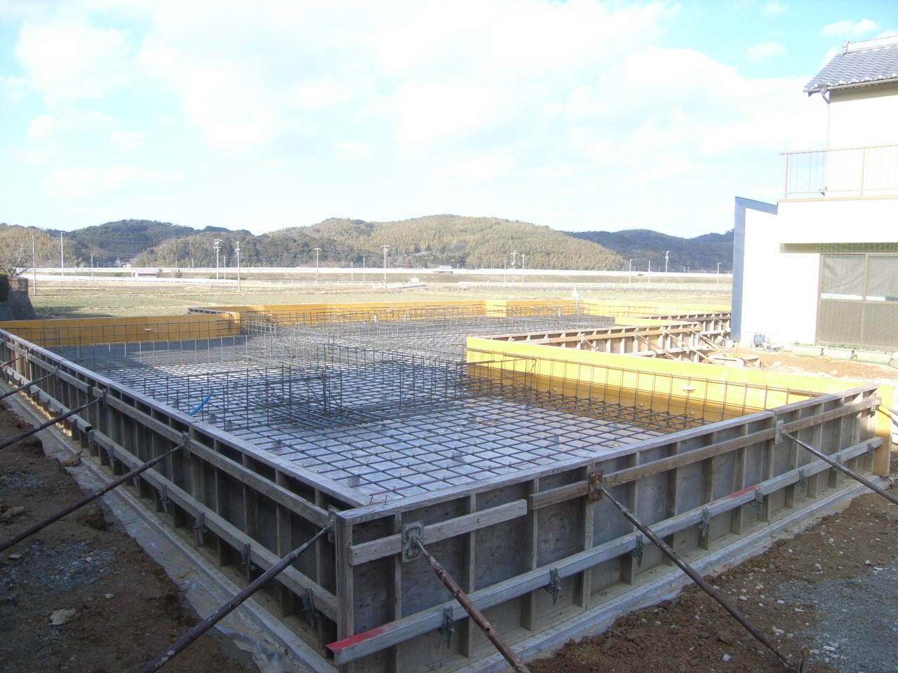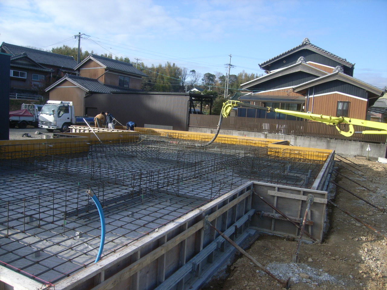 基礎の外周に型枠を組んでコンクリートが漏れないようにしてから、ベース部分のコンクリートを打設していきます。