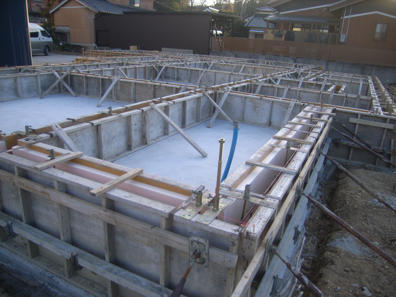 ベース部分のコンクリートが乾けば、今度は内部の立ち上がり部分に型枠を組んでコンクリートを打設します。